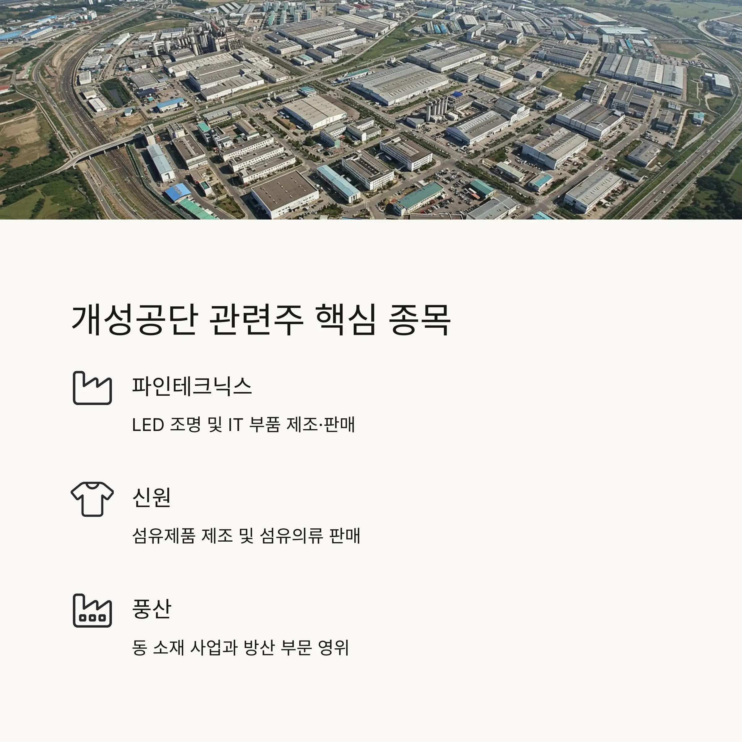 개성공단은 특히 섬유/의류 업종이 주를 이루고 있어, 이 업종의 기업들이 남북경협 재개 시 가장 큰 수혜를 볼 것으로 예상돼요. 👕