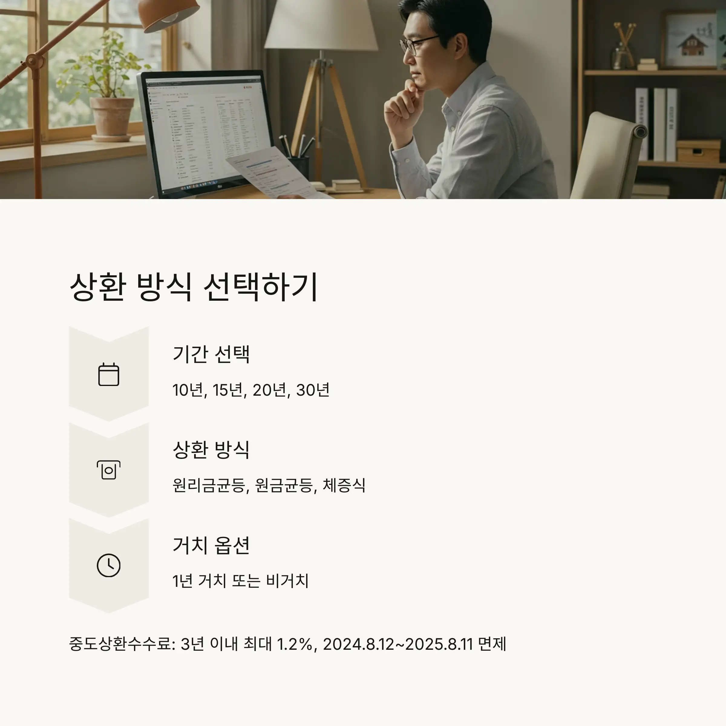대출 기간은 10년, 15년, 20년, 30년 중 선택 가능하고, 다음 3가지 상환 방식 중 하나를 선택할 수 있어요: