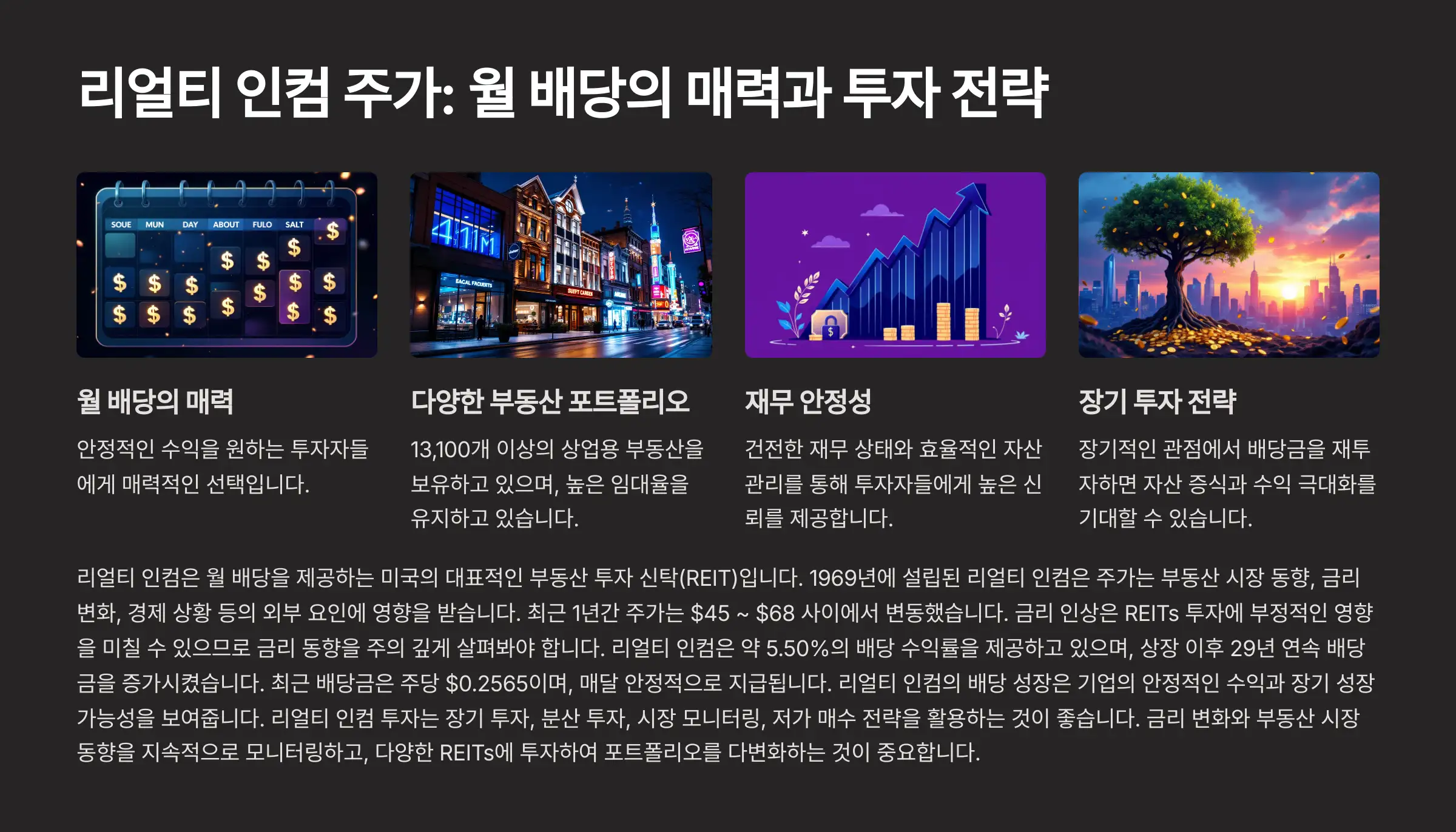 이 글에서는 리얼티 인컴의 주가 변동, 배당 수익률, 재무 상태, 그리고 성공적인 투자 전략에 대해 상세히 살펴보겠습니다.