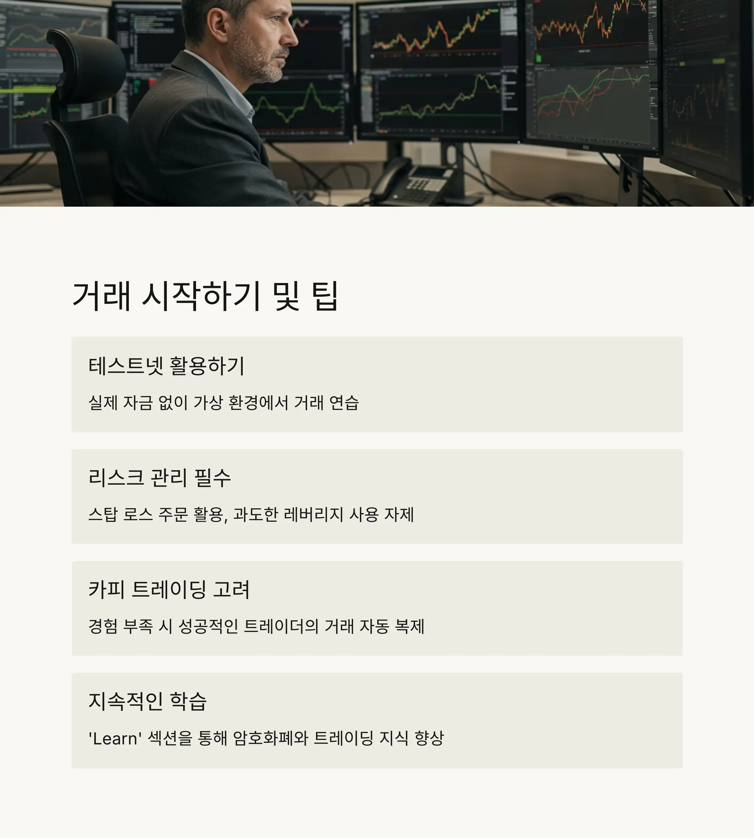 넷째, 리스크 관리에 항상 신경 쓰세요. 투자금은 잃어도 괜찮은 금액으로 제한하고, 한 번의 거래에 모든 자금을 투입하지 않는 것이 중요해요. 또한 스탑 로스 주문을 적극 활용하여 손실을 제한하고, 레버리지 거래 시에는 과도한 레버리지를 사용하지 않도록 주의하세요.