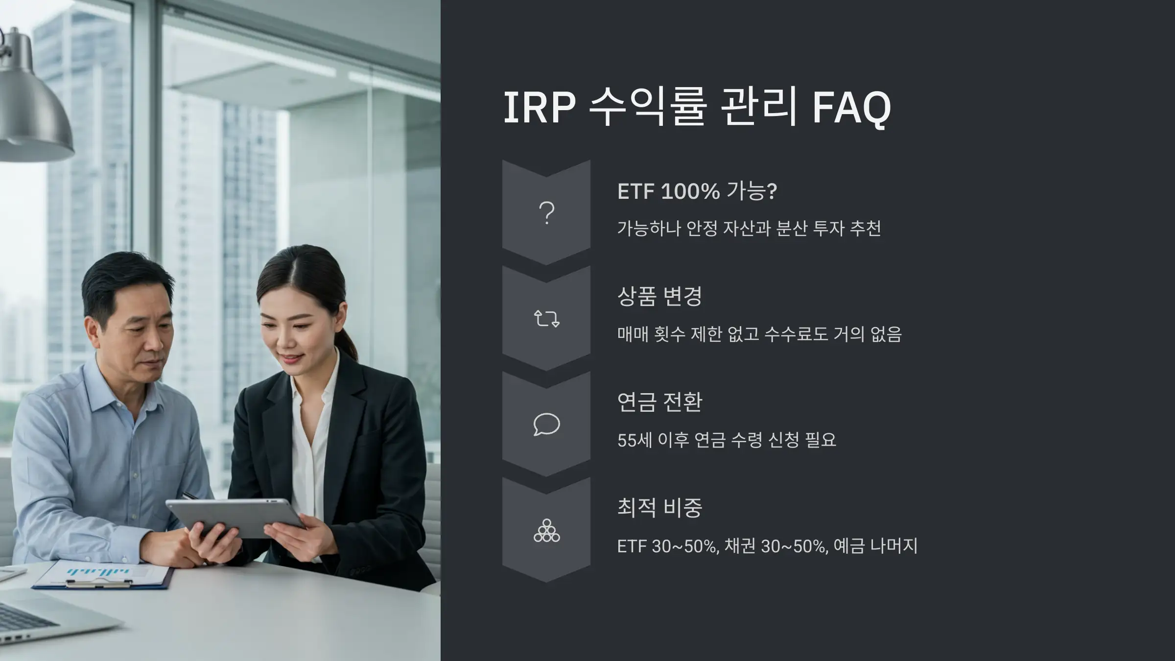 A4. 네! IRP 내에서는 매매 횟수 제한이 없고, 수수료도 거의 없기 때문에 자산 비중 조정은 언제든 자유롭게 가능해요.