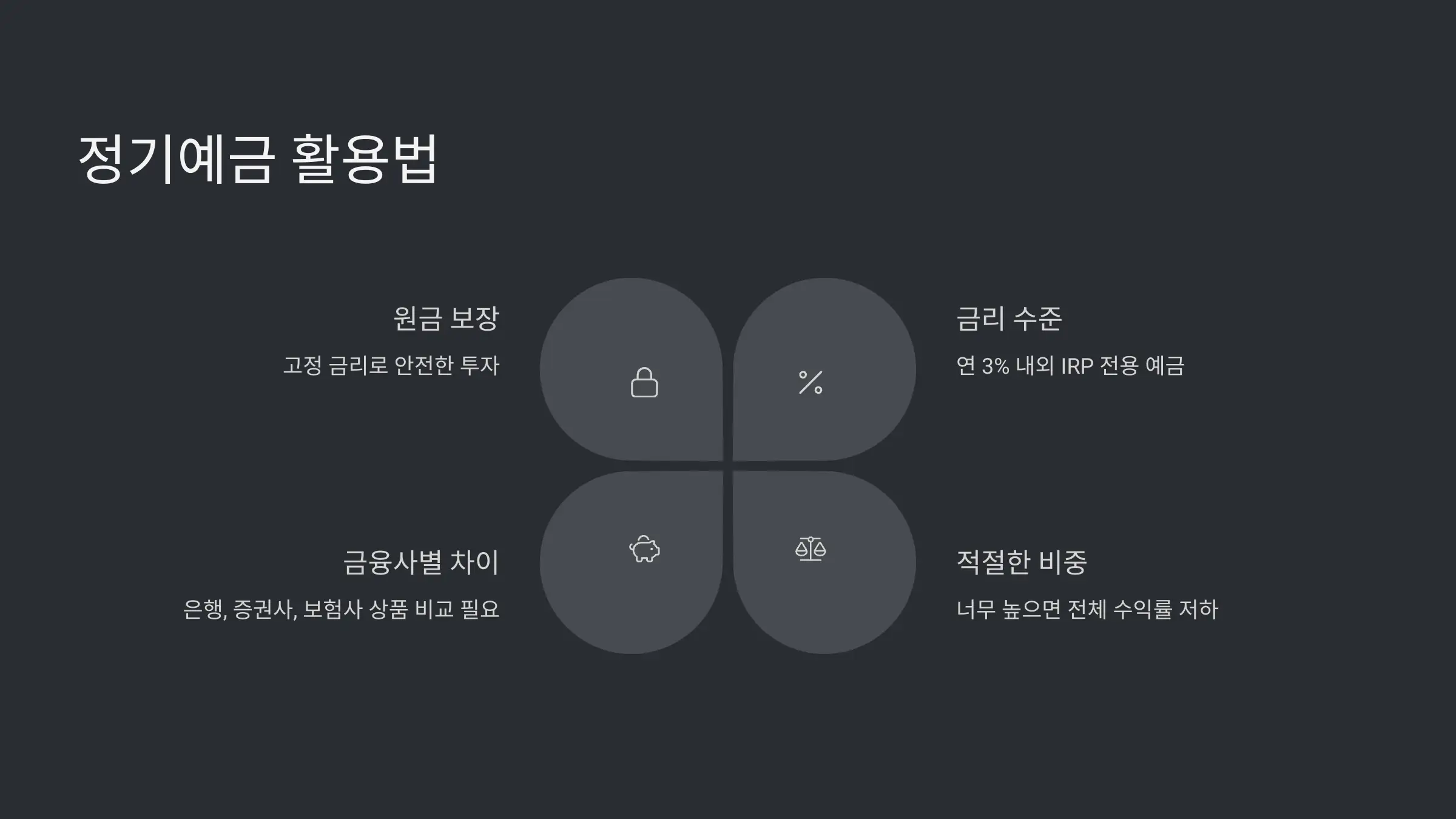 특히 퇴직금을 IRP에 이체했는데, 아직 자산 배분 계획이 없다면 단기적으로 예금에 넣어두는 것도 좋은 방법이에요. 기본적인 안전망 역할을 해주면서, 금리도 일정 수준 받을 수 있어요.