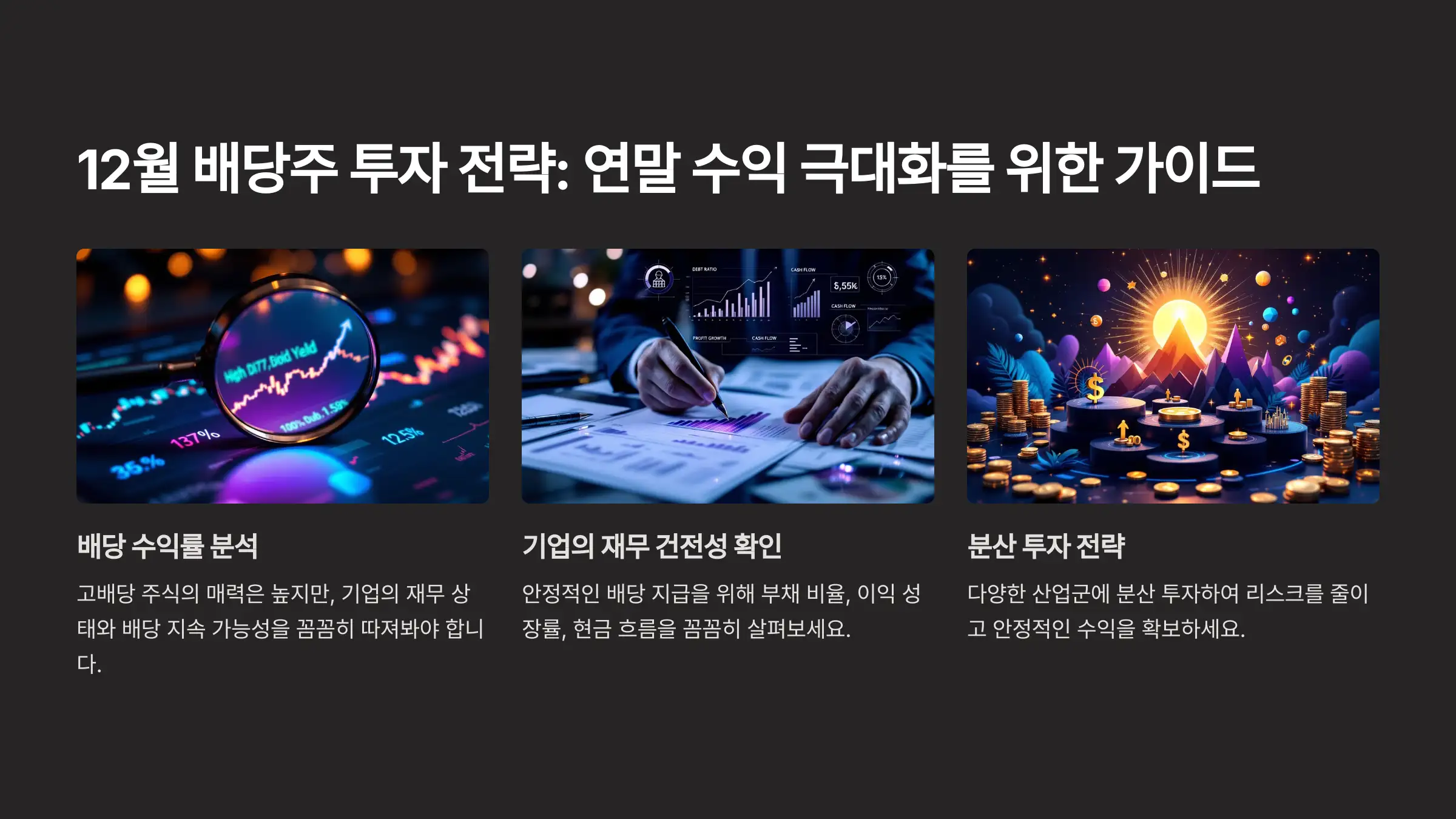 12월은 배당주 투자의 최적기입니다. 하지만 단순히 배당 수익률만 보고 투자하기보다는 기업의 재무 건전성, 배당 성장률, 산업 전망 등을 종합적으로 고려해야 합니다.