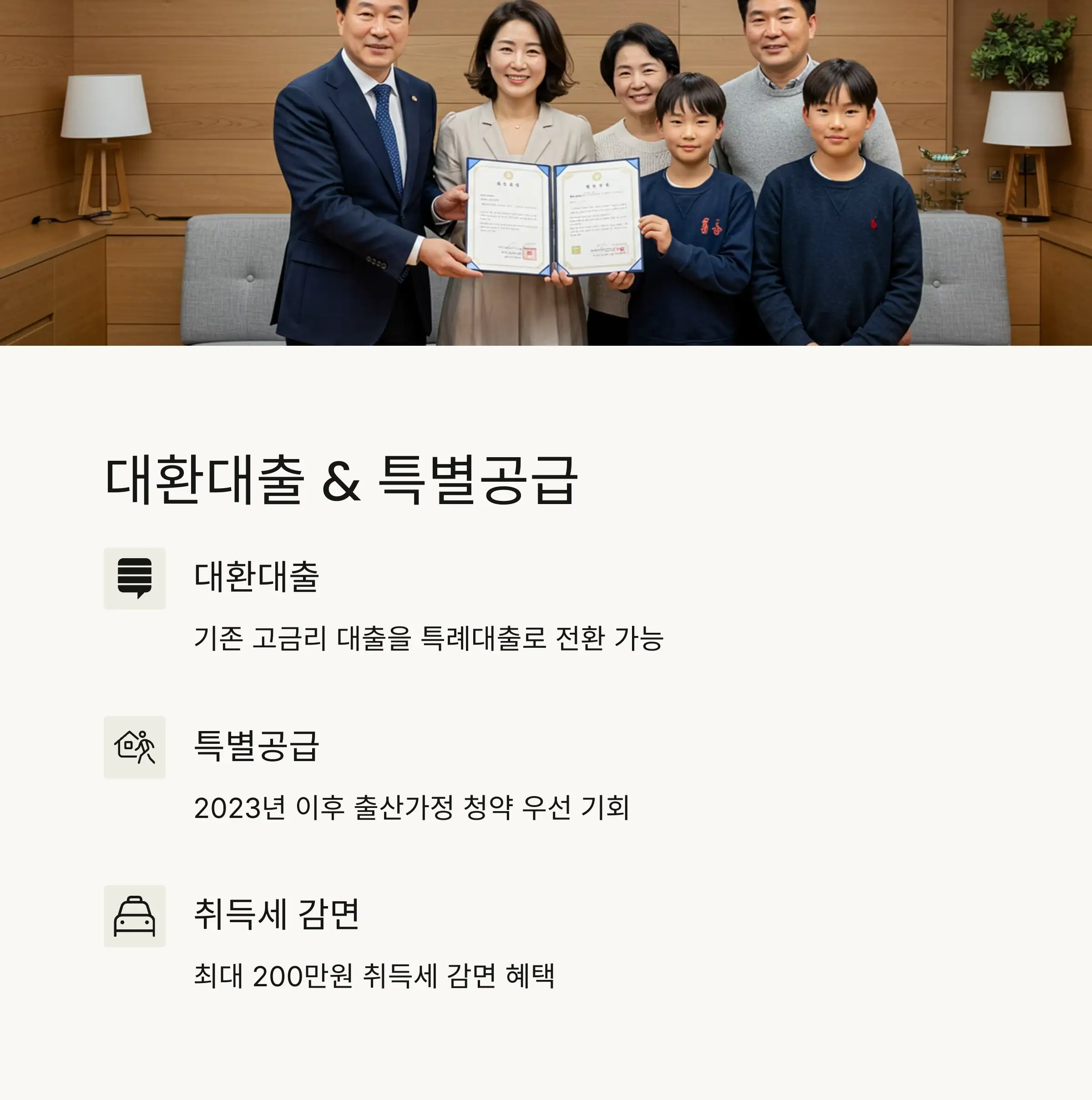 집 마련에 들어가는 초기 비용이 부담된다면, 대출+특별공급+세금감면까지 3종 세트를 활용하면 정말 많은 도움이 돼요!