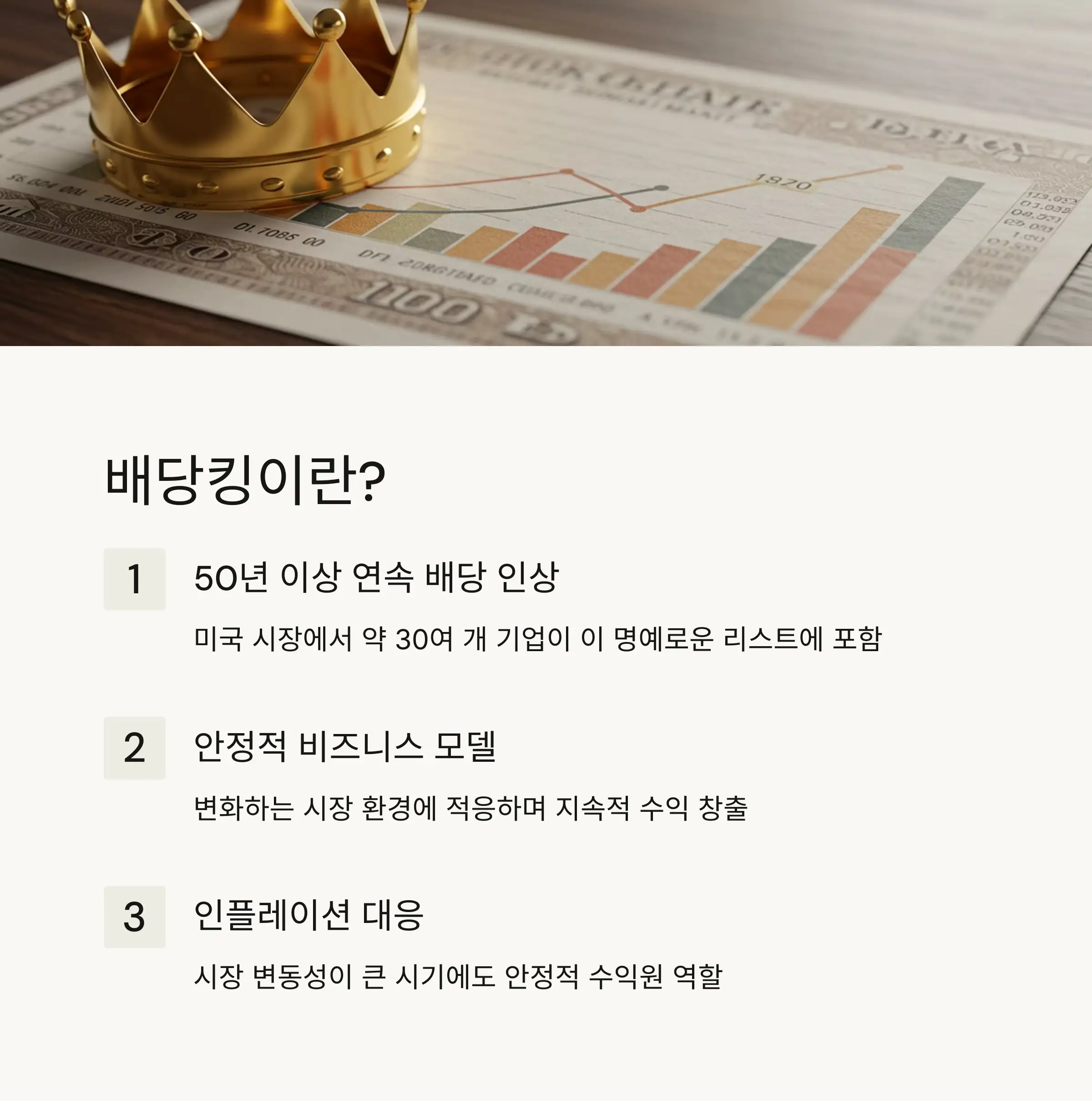 배당킹(Dividend Kings)은 50년 이상 연속으로 배당금을 인상해온 우량 기업들을 의미해요. 이 기업들은 경기 침체, 금융 위기, 팬데믹 등 다양한 경제 상황에서도 꾸준히 주주에게 수익을 분배해 온 안정적인 기업들이랍니다. 2025년 현재 이런 배당킹 기업들은 장기 투자자들에게 큰 관심을 받고 있어요.