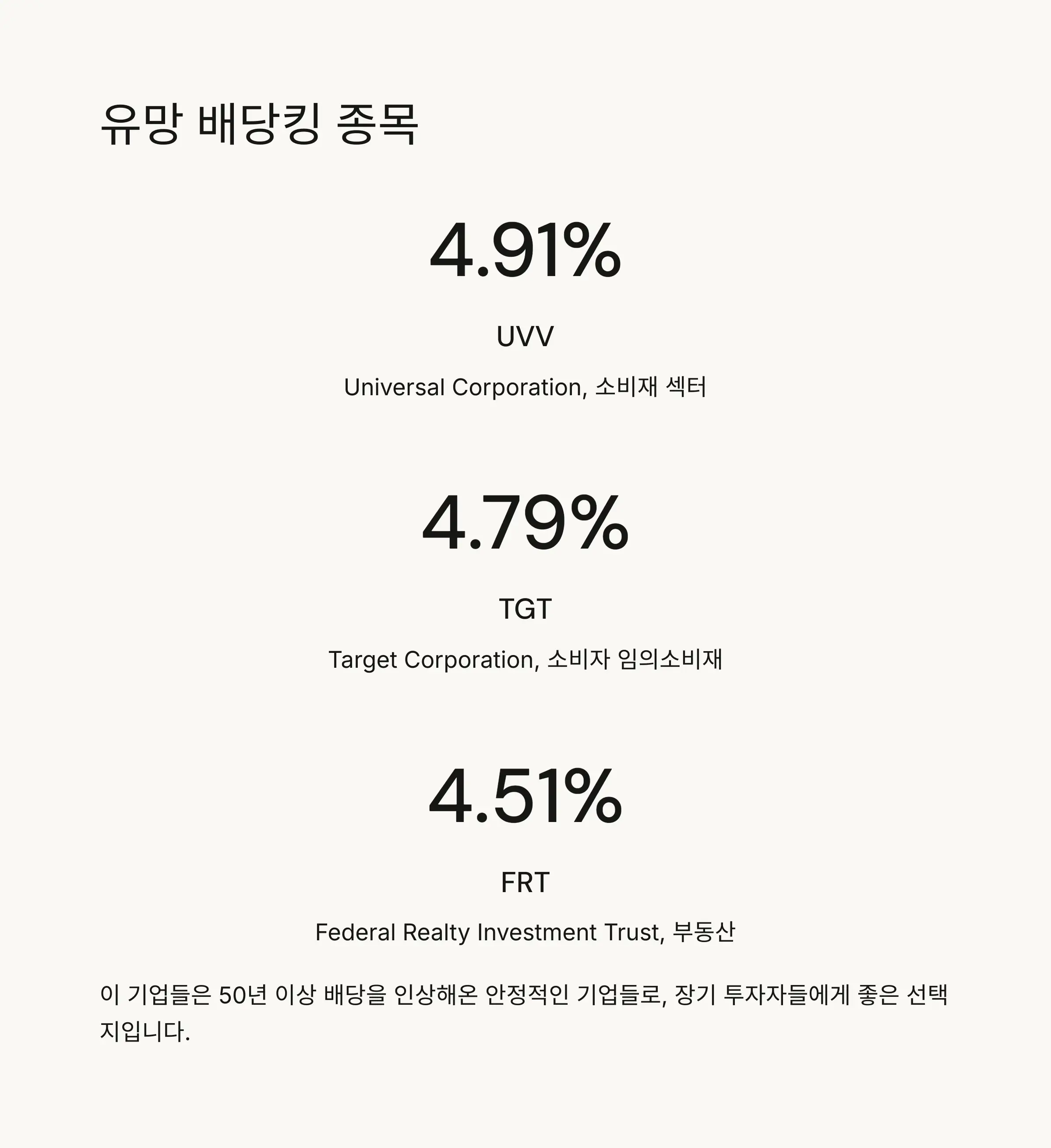 | 4 | UVV (Universal Corporation) | 소비재 | 54 | 4.91% |