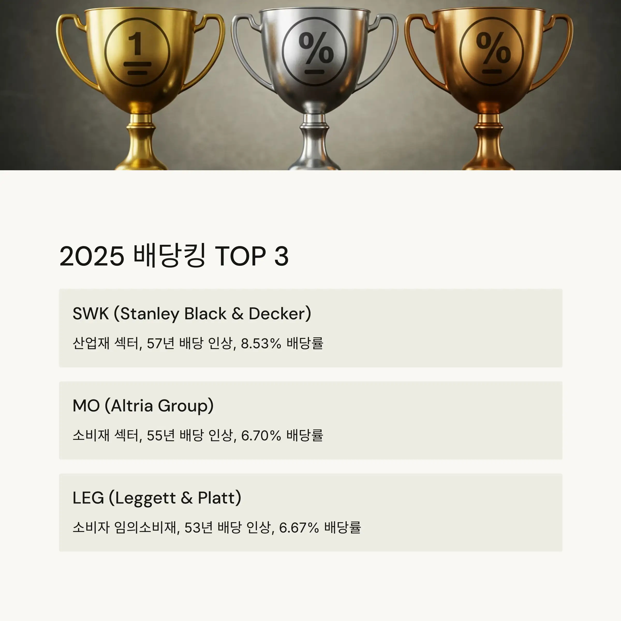 | 1 | SWK (Stanley Black & Decker) | 산업재 | 57 | 8.53% |