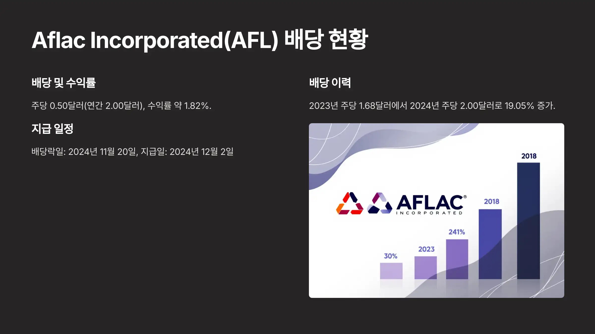 Aflac Incorporated(AFL)는 안정적인 배당 정책과 글로벌 보험 시장에서의 강력한 입지를 가진 기업으로, 투자자들에게 매력적인 배당주로 평가받고 있습니다.